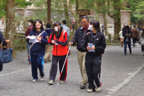 写真2:視覚障害のKさん。女子高生のサポートを受けてニコニコ。