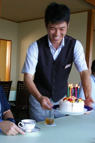 びっくりして振り返ると、そこには、満面の笑みでケーキを持ったスタッフの方の姿。