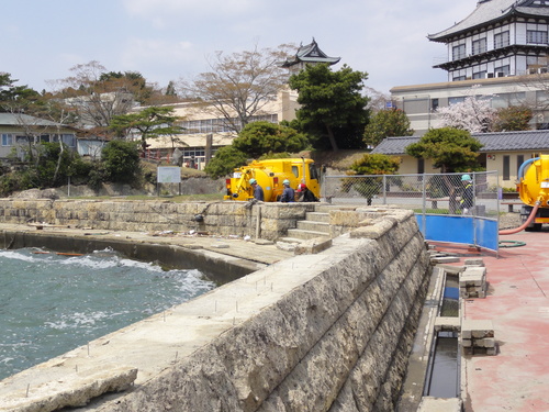 さて駐車場ですが、海岸一帯を中心に県営5箇所、町営2箇所、民営7箇所あり、町営以外有料。但し、津波により県営はゲートマシンが壊れ4月26日現在全箇所無料開放中。また民営は全てチェックした訳ではないのですが、観光船桟橋向かいのコインパーキングはフラップ装置が海水をかぶり、作動不能で利用できない状態でした。