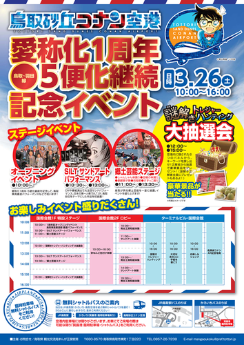 鳥取砂丘コナン空港愛称化1周年・5便化継続記念イベント が開催されますよ。