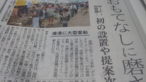 16日3時からの岸壁まで行けるのでカメラを持って岸壁へ・・「ダイヤモンド.プリンセス」11万6千トン乗り組み客は、1980名。バス22台で、鳥取、島根の観光に向かわれましたよ。全長290メートルもあり、カメラに収まりきれない大きさでした。wifiや両替機など初の設置など・・英語などが話せる、観光案内通訳ボランティアの人たちとの笑顔での対応が、とても印象的でしたよ。今年10月までに、あと3回寄港する予定とか・・沢山の方たちに両県を楽しんでいただきたいですね。