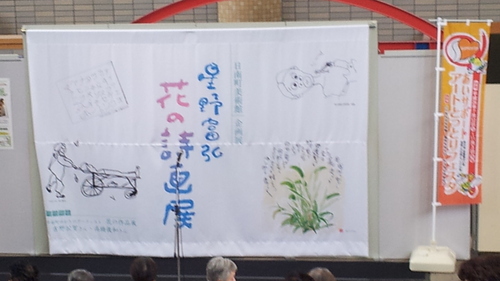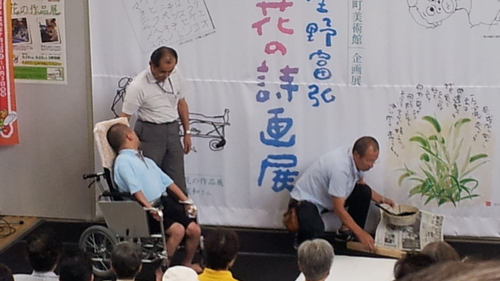 8/29日星野富弘さんの画集が開催され鳥取県日南町でオープニングイベントがあり、参加しました。午後12時半からのイベントで富弘美術館の館長さんが、ご本人からのメッセージを代読されました。70点の作品は、大半が草と花。1枚の用紙の中に、花と字を書くことはとても難しいことですが、欠けている2つがお互いに支え合っている。不自由な体だが毎日、一生懸命、生きようとしている。など・・・撮影はもちろん禁止でしたがどの作品も素敵なものばかりでした。県外から来られた方も大勢。沢山の方たちが、絵によって生かされている と言っておられました。☆倉吉からの書道家、高橋さん。肢体不自由ですが、左足の指の間に筆を挟み、書を書かれました。「花」という漢字。凄いの感嘆と拍手でした。色々な障がいがあっても、それぞれ、一生懸命に活きてますと・・・