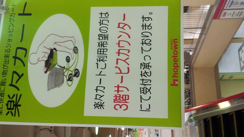 楽々カート足腰の悪い方が買い物をしやすいように、楽々カート5台が米子市ホープタウンに置かれました。今日、行って写真を撮らせていただきました。身体の体重をかけてゆっくりと歩いて、自分で買い物ができる楽しさ。もっと沢山、増えると良いですね。