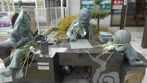 駅前広場で今年も、ブロンズ像の清掃&しめ縄飾りの日でした。