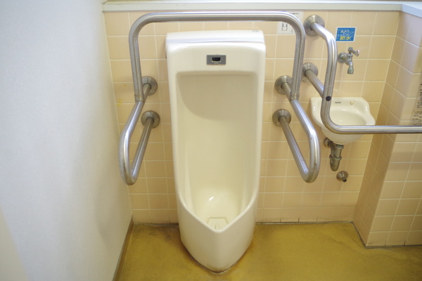 車いすトイレ内にある男性用小便器は手すり付き |
