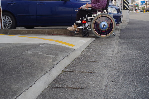 スロープ上がり口に段差があるため、一番奥のなだらかな部分からが通行しやすい |