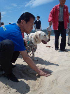砂に触っているとしまる。手で押したりしながら鳴き砂体験をしている写真です。 (^ヮ^)