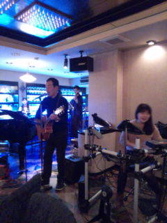 ピアノにてかりゆし忘年会。ギター・バイオリン・ドラムの風景!