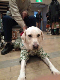 開演前の時間に、日本盲導犬協会島根あさひ訓練センターのPR犬のマルク君とアラン君はとても楽しそうでした。